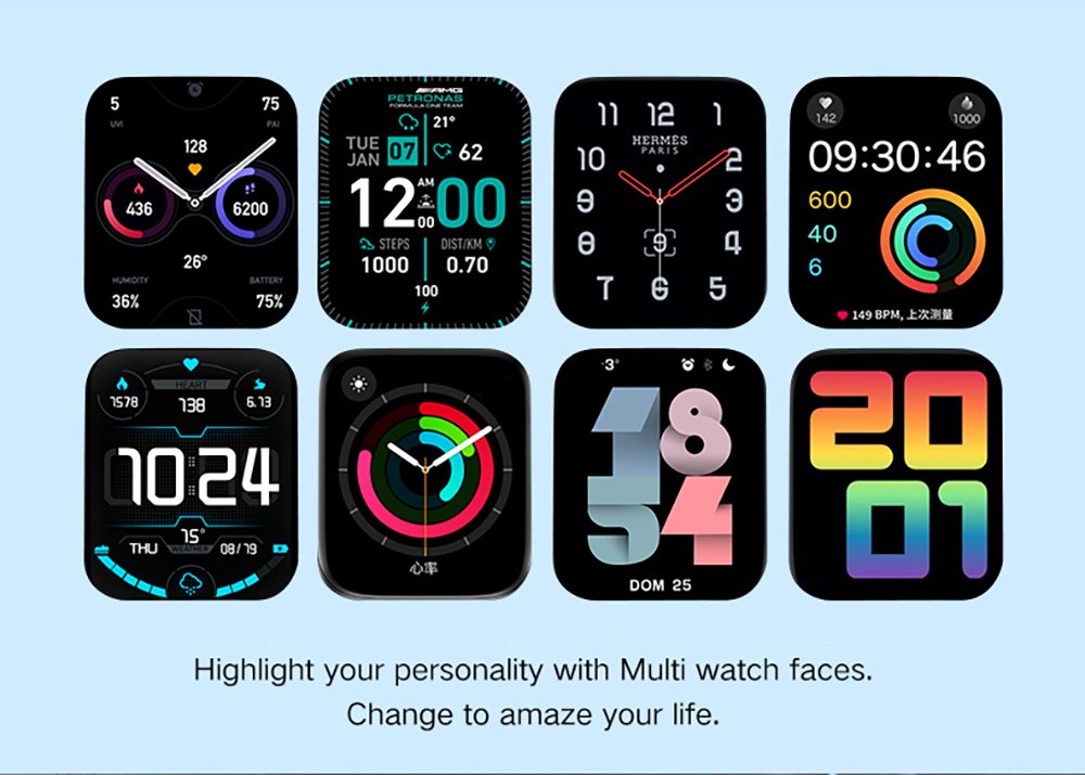 Fonctions : étanche, divertissement audio et vidéo, photographie, comptage des pas, surveillance de la fréquence cardiaque, mesure de la pression artérielle, divertissement social, appel Bluetooth, rappel intelligent, prise de vue à distance, surveillance du sommeil, détection de l’oxygène dans le sang, poussée d’informations, suivi de mouvement